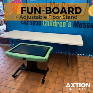 {"id":7233122304105,"title":"Fun Board 32\" + Adjustable Stand - Interactive Touch Pad","handle":"fun-board-32-adjustable-stand-interactive-touch-pad","description":"\u003cp data-mce-fragment=\"1\"\u003eFun Board is an interactive game table for children and adults. It’s just like a tablet, but bigger and better. The Funboard has a thin design, and includes an adjustable stand.\u003c\/p\u003e\n\u003cp data-mce-fragment=\"1\"\u003eThe Low height monitor cart has 4 locking wheels, that allow you to move the Fun Board to any location. It can be adjusted 90 degrees to display Horizontally, at an angle, or vertically to get the perfect viewing angle.\u003c\/p\u003e\n\u003cp data-mce-fragment=\"1\"\u003eChildren are drawn to the engaging content and get quickly absorbed in the games and the will to explore. What makes the Gaming Touch Table unique is that several children can simultaneously point, draw, click around and search for information and it promotes their collective learning.\u003cbr\u003e\u003c\/p\u003e\n\u003cp data-mce-fragment=\"1\"\u003eFunBoard is mobile enough to be placed wherever you want, but stable and sturdy enough to survive kids having fun.\u003c\/p\u003e\n\u003cp data-mce-fragment=\"1\"\u003eCreated for kids pre-school through 8\u003csup data-mce-fragment=\"1\"\u003eth\u003c\/sup\u003e grade, it gives children the opportunity to play and learn together through creative and challenging educational programs and games.\u003c\/p\u003e\n\u003cp data-mce-fragment=\"1\"\u003e\u003cstrong\u003eFeatures:\u003c\/strong\u003e\u003c\/p\u003e\n\u003cul\u003e\n\u003cli\u003eIncludes over 50 Programs.\u003c\/li\u003e\n\u003cli\u003eLarge 32” touch screen built into a stable, colorful and durable table.\u003c\/li\u003e\n\u003cli\u003eThe screen includes precision technology, and a hardened, anti-reflex treated 5 mm thick protective glass. Kids can crawl, stand or jump on FunBoard without damaging the unit.\u003c\/li\u003e\n\u003cli\u003eBoard is made of durable environmentally friendly plastic with no toxins.\u003c\/li\u003e\n\u003cli\u003eAccess to Google Store to add more applications.\u003c\/li\u003e\n\u003cli\u003eEasy connection to Bluetooth and WiFi\u003c\/li\u003e\n\u003cli\u003ePlug \u0026amp; Play Design. Everything is pre-loaded.\u003c\/li\u003e\n\u003cli\u003eColor options: Blue, Green\u003c\/li\u003e\n\u003c\/ul\u003e\n\u003cp\u003e\u003cspan style=\"text-decoration: underline;\"\u003eSpecifications: Fun Board\u003c\/span\u003e\u003cbr data-mce-fragment=\"1\"\u003eSize: 37 L x 26 W x 4 D Inch (940 L x 646 W x 100 D mm)\u003cbr data-mce-fragment=\"1\"\u003eWeight: 40 LBS. (18 KG)\u003cbr\u003e\u003cspan\u003eAndroid Operating System.\u003c\/span\u003e\u003cbr\u003e\u003cspan\u003e10 Touch Points, Multitouch Interface.\u003c\/span\u003e\u003c\/p\u003e\n\u003cp\u003e\u003cspan\u003e\u003cspan style=\"text-decoration: underline;\"\u003eSpecifications Stand \/ Cart:\u003c\/span\u003e\u003cbr\u003eLow profile design is ideal for kids use.\u003cbr\u003e\u003c\/span\u003e\u003cspan\u003e0-90 degree tilt.\u003cbr\u003e4 Wheel casters with brakes.\u003cbr\u003e4 Height positions. (29\" to 35\")\u003c\/span\u003e\u003cspan\u003e\u003c\/span\u003e\u003c\/p\u003e\n\u003cp\u003e\u003cem\u003e \u003ca class=\"btn_c\" href=\"\/\/\/\/axtiontech.com\/pages\/contact\"\u003eContact Us For Custom Price Quote\u003c\/a\u003e\u003c\/em\u003e\u003c\/p\u003e\n\u003cp\u003e \u003c\/p\u003e\n\u003cp\u003e\u003cem\u003e\u003ciframe width=\"560\" height=\"315\" src=\"https:\/\/www.youtube.com\/embed\/SRtFOR5H8nk\" title=\"YouTube video player\" frameborder=\"0\" allow=\"accelerometer; autoplay; clipboard-write; encrypted-media; gyroscope; picture-in-picture\" allowfullscreen=\"\"\u003e\u003c\/iframe\u003e\u003c\/em\u003e\u003c\/p\u003e\n\u003cp\u003e\u003cem\u003eTouch Table Games, Multi-touch experience, Gaming Touch Table Solutions, Game Table Fitness Gaming\u003c\/em\u003e\u003cbr\u003e\u003c\/p\u003e","published_at":"2024-04-15T10:53:51-05:00","created_at":"2024-04-15T10:36:43-05:00","vendor":"Active Touch Screen Games","type":"","tags":["Application_Therapy","Best Seller","Category_Best Seller","Category_Table Games"],"price":260000,"price_min":260000,"price_max":295000,"available":true,"price_varies":true,"compare_at_price":null,"compare_at_price_min":0,"compare_at_price_max":0,"compare_at_price_varies":false,"variants":[{"id":41351962394729,"title":"Android + Weco Play","option1":"Android + Weco Play","option2":null,"option3":null,"sku":null,"requires_shipping":true,"taxable":false,"featured_image":null,"available":true,"name":"Fun Board 32\" + Adjustable Stand - Interactive Touch Pad - Android + Weco Play","public_title":"Android + Weco Play","options":["Android + Weco Play"],"price":275000,"weight":113398,"compare_at_price":null,"inventory_quantity":0,"inventory_management":null,"inventory_policy":"deny","barcode":null,"requires_selling_plan":false,"selling_plan_allocations":[]},{"id":41351962427497,"title":"Android + Weco Play + Active Entertainment","option1":"Android + Weco Play + Active Entertainment","option2":null,"option3":null,"sku":null,"requires_shipping":true,"taxable":false,"featured_image":null,"available":true,"name":"Fun Board 32\" + Adjustable Stand - Interactive Touch Pad - Android + Weco Play + Active Entertainment","public_title":"Android + Weco Play + Active Entertainment","options":["Android + Weco Play + Active Entertainment"],"price":295000,"weight":113398,"compare_at_price":null,"inventory_quantity":0,"inventory_management":null,"inventory_policy":"deny","barcode":null,"requires_selling_plan":false,"selling_plan_allocations":[]},{"id":42424734220393,"title":"Pad Only + Android","option1":"Pad Only + Android","option2":null,"option3":null,"sku":null,"requires_shipping":true,"taxable":false,"featured_image":null,"available":true,"name":"Fun Board 32\" + Adjustable Stand - Interactive Touch Pad - Pad Only + Android","public_title":"Pad Only + Android","options":["Pad On